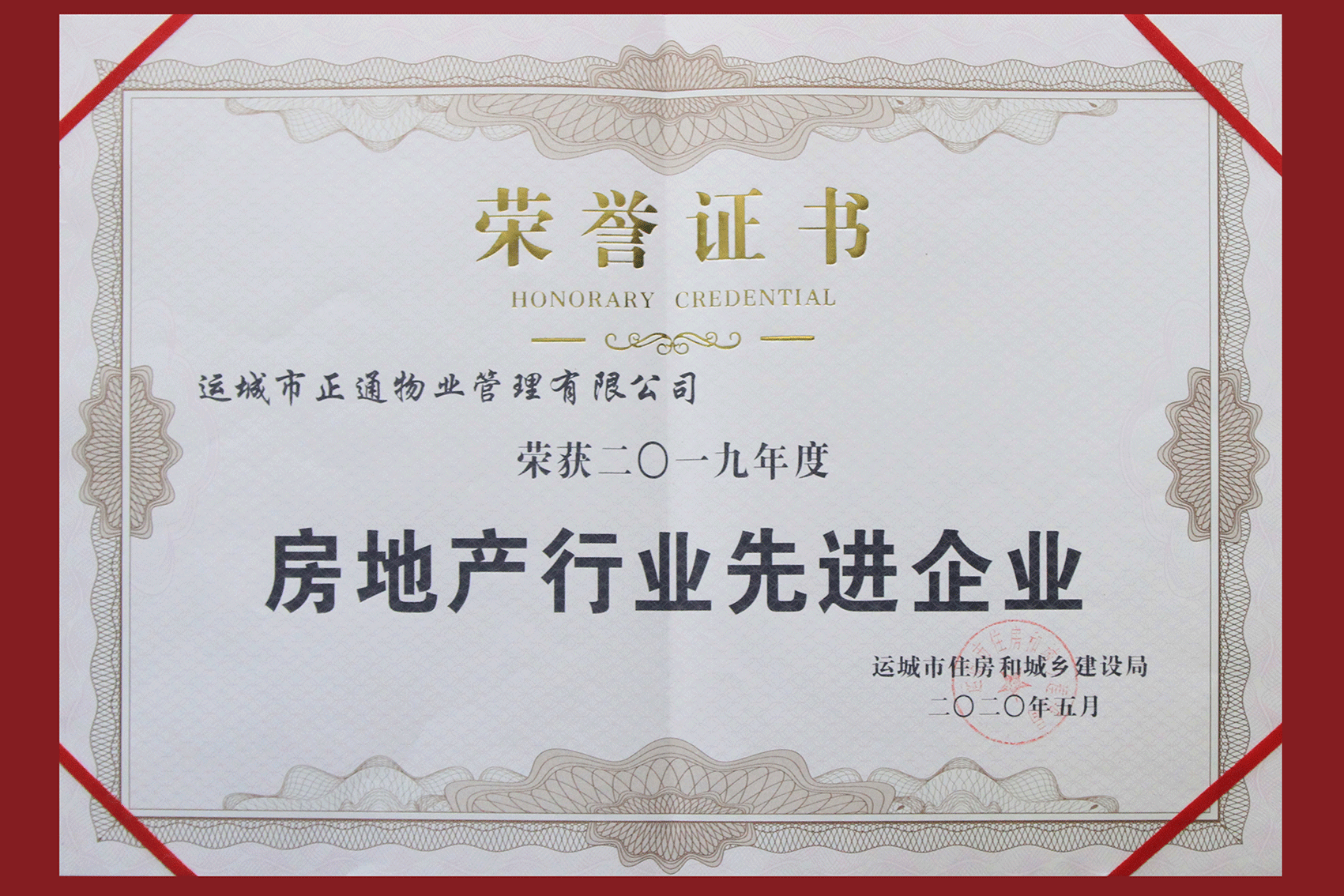 ▲運城市正通物業管理有限公司榮獲“2019年度房地產行業先進企業”