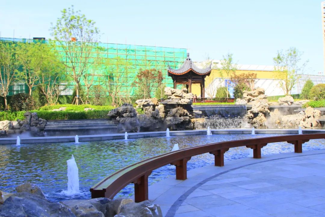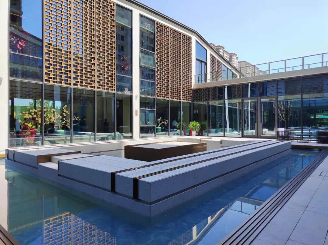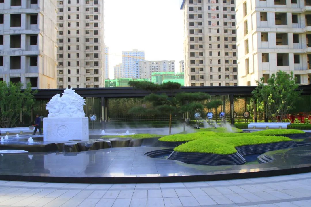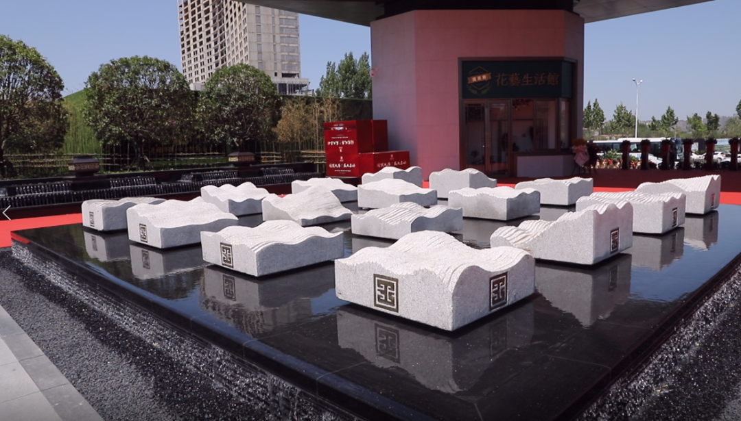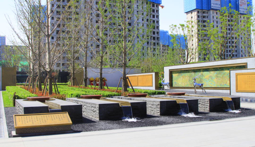 坐落在歷史景觀長(zhǎng)軸與和軸的十字交叉點(diǎn),水景以黑金砂鋪設(shè),呈現(xiàn)出“和”字樣式,池底為景泰藍(lán)石材,與周邊不銹鋼流水缽、漢白玉玉璽、造型迎客松等連成一體;從高空俯瞰看,它像是印章一樣印在我們國(guó)賓府的中心,寓意國(guó)賓府業(yè)主家和萬(wàn)事興。